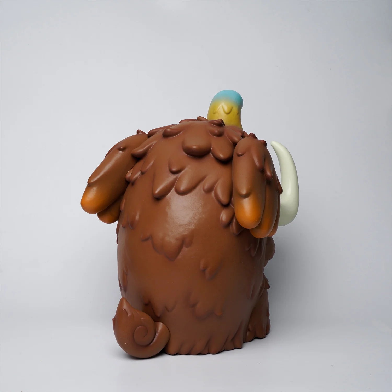 Elfie, the larger of the two, showcases a rich, earthy brown with a subtle blue-tipped trunk and magnificent tusks, exuding playful majesty.