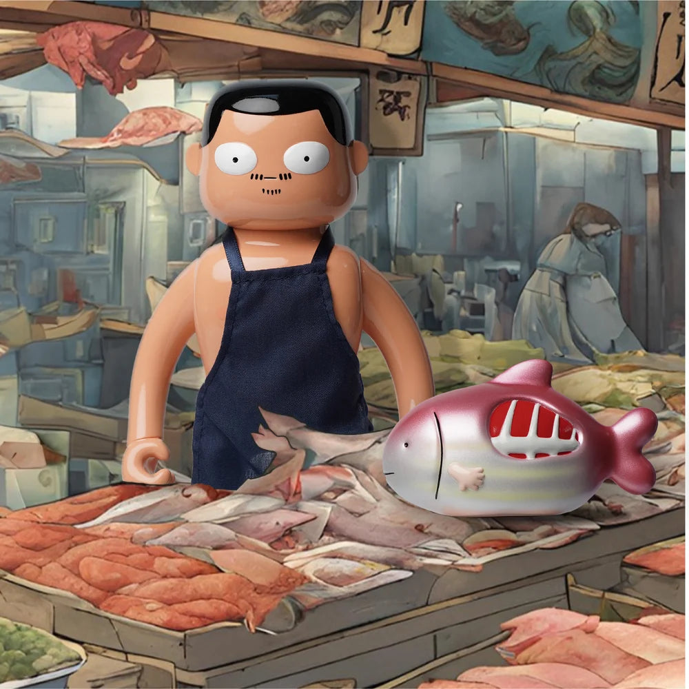 Mr. Nobodies' quirky dual persona comes to life with interchangeable heads: one reflecting the look of a puzzled corporate professional and the other playfully shaped like a fish, infusing humor and surrealism into any collector’s display.